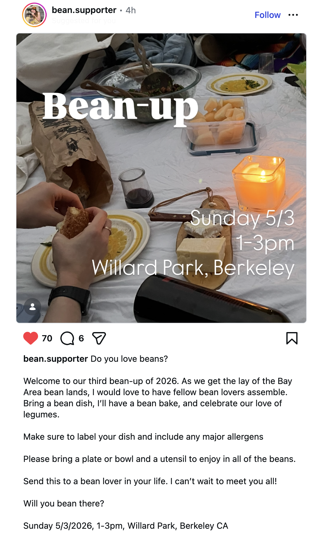 A benefit to support the direct aid work of ARTISTS UNITE FOR PALESTINE and Palestine - Ireland Student SolidaritySATURDAYDay Trip Drag Brunch at Beaux in the Castro May 2nd, SF, Shows at 12:30 & 2:30pm]. Tickets just $10 here: “We have queens & kings & drag things for you & we will be celebrating Misterrr's 40th birthday & we wanna celebrate YOU! Brunch food is Taco Boys! So yummy! Thanks for the support!” 2344 market streetSUNDAYBean-up [May. 3, Berkeley, 1-3pm] A bean-themed gathering for fellow bean lovers at Willard Park in Berkeley. Attendees are invited to bring a bean dish, enjoy a bean bake, celebrate legumes, label their dish with major allergens, and bring a plate or bowl plus a utensil. (free)DIY Sound 101 (workshop [May 3rd, Richmond 1-3pm] , Free workshop about live sound. Participants are invited to become part of the live sound team and learn how changing voltages produce sound, how to operate a PA, load in bands, mix sound, troubleshoot issues, and shut everything down safely. Taught by Kirk Pearson and open to anyone, though suggested for ages 13+. At the Planetarium